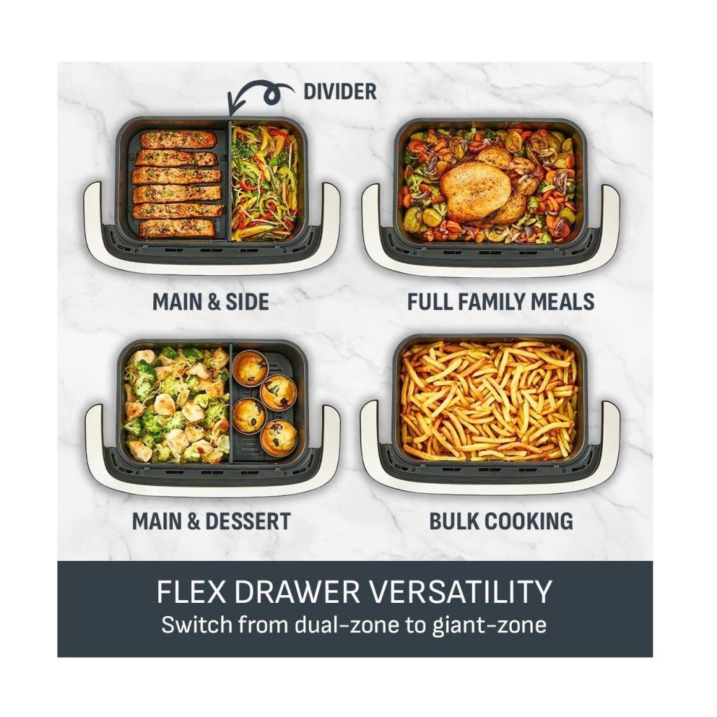 ویژگی متمایز این سرخکن، وجود دو محفظه مجزا (Dual Drawer System) است که به شما امکان میدهد دو نوع غذا را بهصورت همزمان بپزید. برای مثال میتوانید در یک محفظه سیبزمینی سرخ کنید و در دیگری مرغ یا ماهی بپزید.